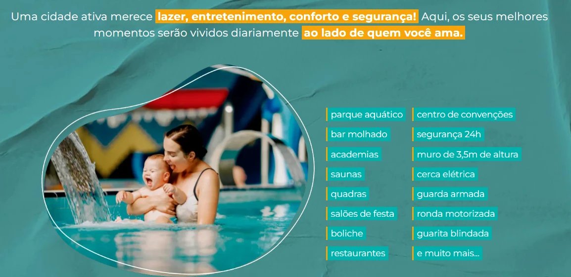 Piscina adulto e infantil acesso de cadeirante / Quadras de Beach Tênis / Quadras poliesportivas / Churrasqueiras  / Conveniência / Playgrounds Centro de convenções / Espaço ecumênico.